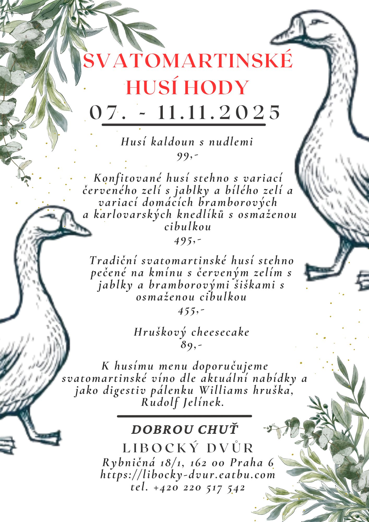 Přijďte si vychutnat křupavou svatomartinskou husu s tradičním domácím zelím a variací knedlíků v historickém prostředí Libockého dvora.